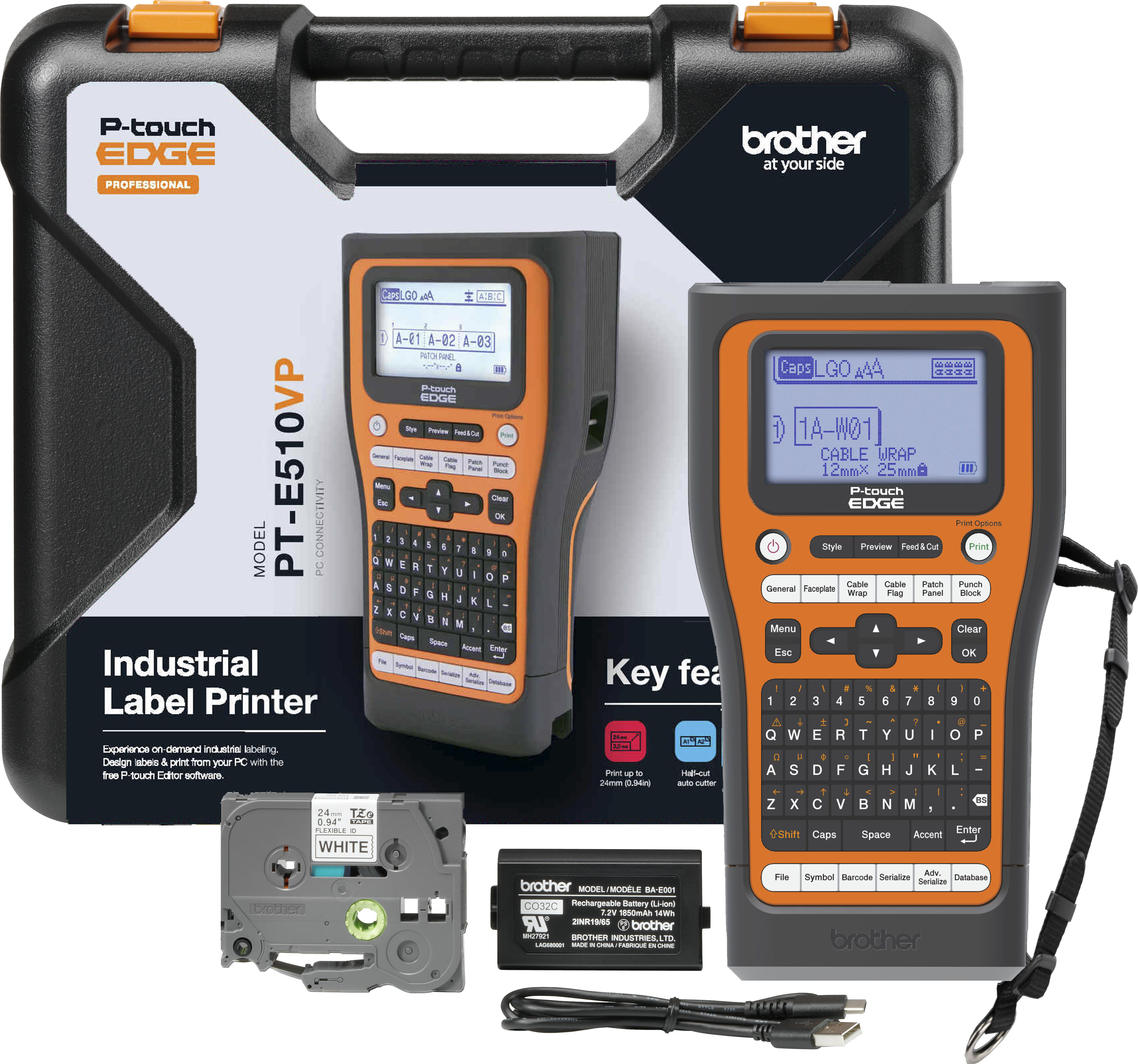 Capaz de imprimir em fitas TZe e tubos termoencolhíveis, o PTE510VP oferece versatilidade para atender às mais variadas necessidades. Acompanha uma maleta resistente, adaptador de energia, bateria recarregável e fita de teste, garantindo praticidade e mobilidade para o uso em campo ou no escritório.